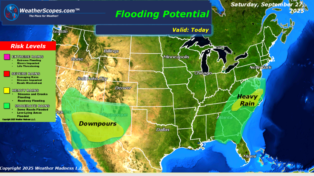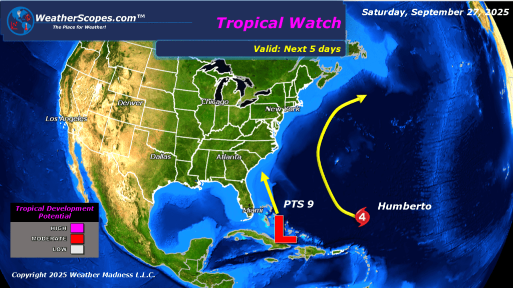 Today we will see some showers and thunderstorms across the Mid-Atlantic states which will bring some heavy rains and some possible localized flooding. The Southwest will also see some showers and thunderstorms today, with some heavy downpours at times. Wildfire smoke still poor in the Pac NW and slightly improving across the eastern part of the US. The latest development in the tropics show that Potential Tropical Cyclone 9 which will be named Imelda eventually, looks to impact the coast of South and North Carolina. Then Hurricane Humberto will draw PTC 9 away from the US, which is called Fujiwhara Effect. The Fujiwhara Effect is rare and occurs when two nearby cyclonic vortices move around each other and close the distance between the circulations of their corresponding low-pressure areas.