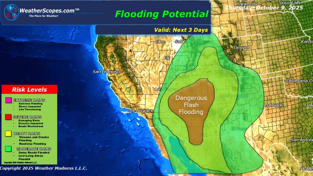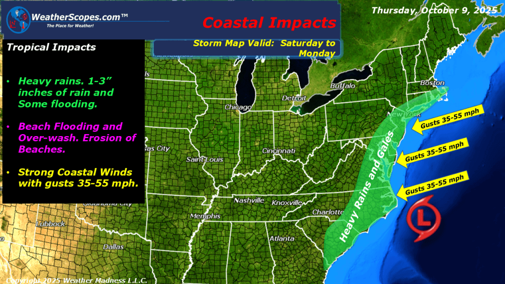 Today some scattered showers across Florida and the Pacific NW. Not a whole lot going on today but this weekend is looking quite busy. Tomorrow in parts of the Northeast and Upper Great Lakes there could be some frost and freezes. The Southwest will see some heavy rains and flash flooding from the remnants of hurricane Priscilla coming up from the Pacific. A coastal storm will develop off the Carolina’s and move to the north to Long Island, bringing gusty winds, rains, and some beach erosion. Tropical Storm Jerry still in the Atlantic with no real threat to the US, as there is some strong shear out ahead of Jerry.