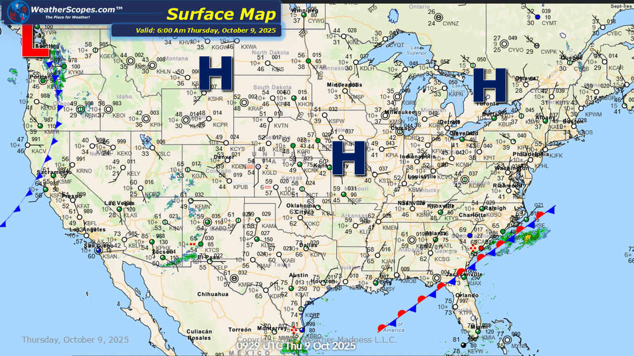 Today some scattered showers across Florida and the Pacific NW. Not a whole lot going on today but this weekend is looking quite busy. Tomorrow in parts of the Northeast and Upper Great Lakes there could be some frost and freezes. The Southwest will see some heavy rains and flash flooding from the remnants of hurricane Priscilla coming up from the Pacific. A coastal storm will develop off the Carolina’s and move to the north to Long Island, bringing gusty winds, rains, and some beach erosion. Tropical Storm Jerry still in the Atlantic with no real threat to the US, as there is some strong shear out ahead of Jerry.