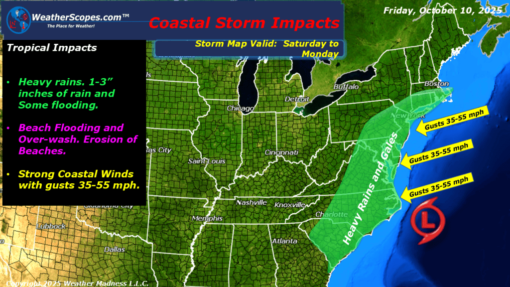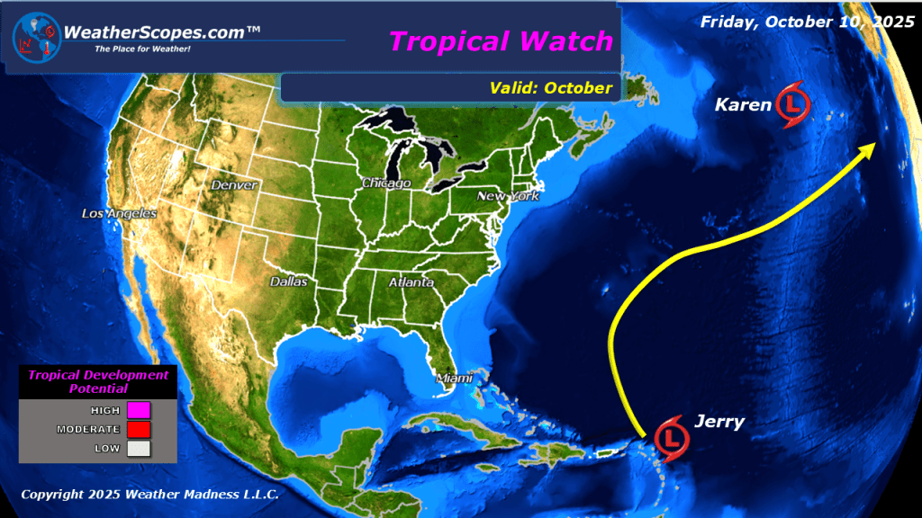 Today we will see some storms in the Pacific NW. Showers and thunderstorms out across the Southwest from the remnants of hurricane Priscilla out in the Pacific. Those rains will bring some flash flooding to area this weekend. A coastal storms off the Carolina’s will bring heavy rains, gusty conditions, and some beach flooding and erosion to the area this weekend. Tropical Storm Jerry and Karen out in the Atlantic. TS Jerry will track away from the US and have no impact. Higher elevations in the Northern Rockies could see some snow this weekend.