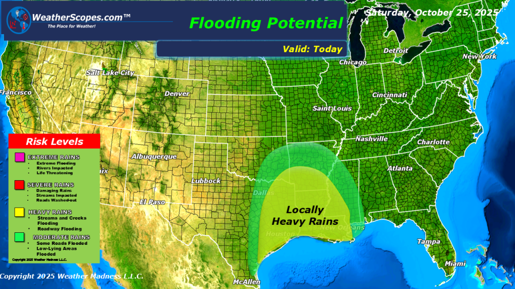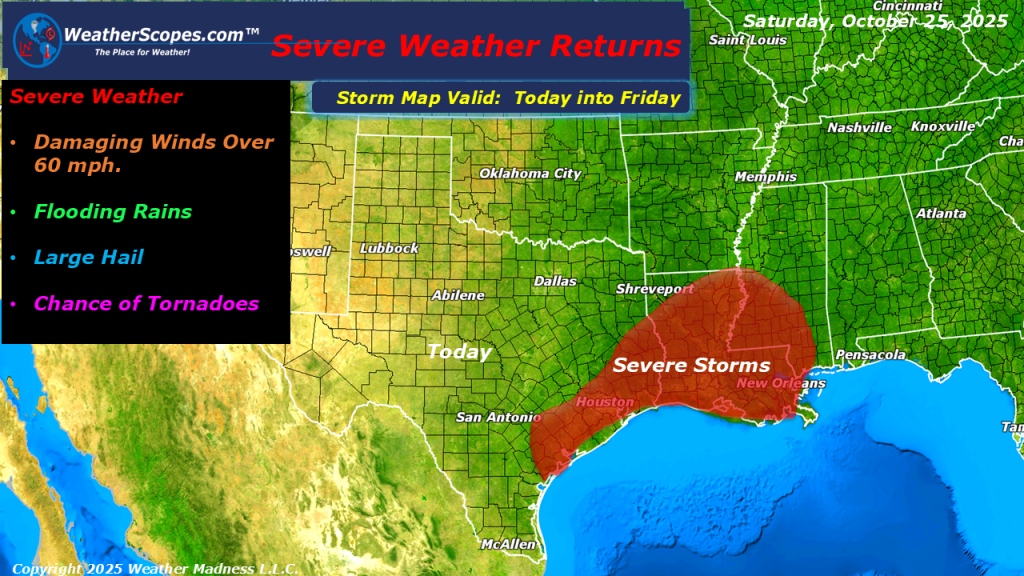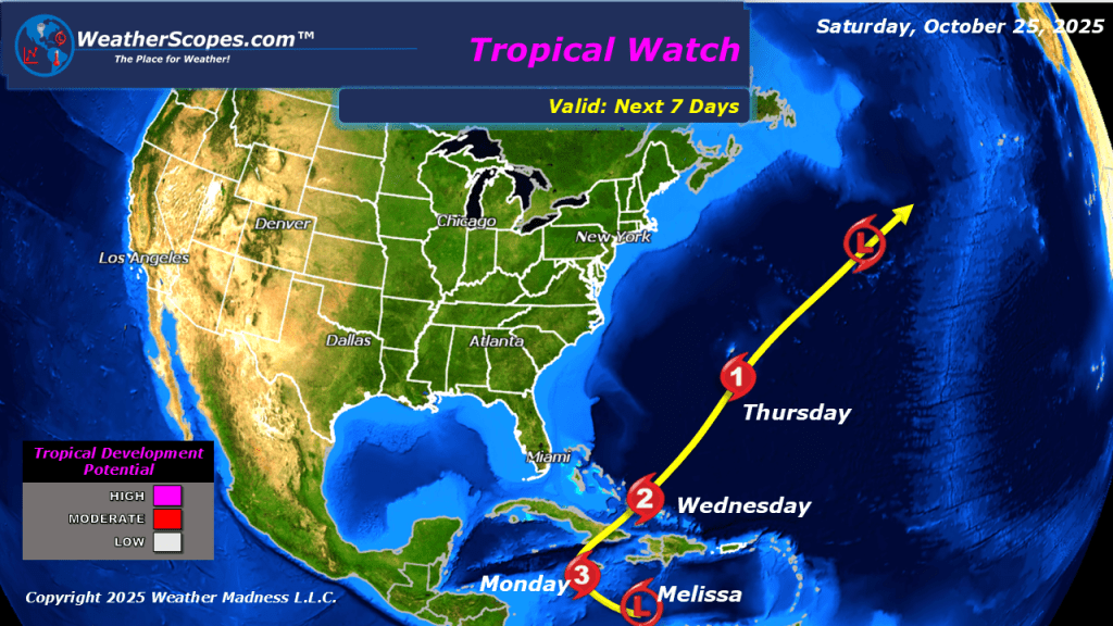 Today showers and thunderstorms will impact Eastern Texas into parts of Louisiana bringing some severe weather to the area. Heavy rains, wind, hail and a tornado can’t be ruled out with these storms. The Pac NW will continue to see showers come into the area today. Some scattered showers across NY today as well. Tropical Storm Melissa still in the Caribbean with a strong rotation on satellite radar. Within the next 24 hours or so Melissa should strengthen into a Cat 3 hurricane.