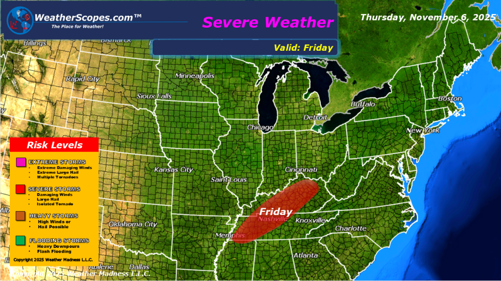 Today more showers and thunderstorms in the Pacific NW. Some scattered showers across parts of the Northeast as well as some cooler temps. There is a chance tomorrow for some severe weather to develop across the Tennessee Valley. Still watching some clipper snow to come into parts of the Plains, Midwest, and Northeast over the weekend. With the potential for some early snowfall to certain areas, to start next week, some cold temps look to come into the area as well.
