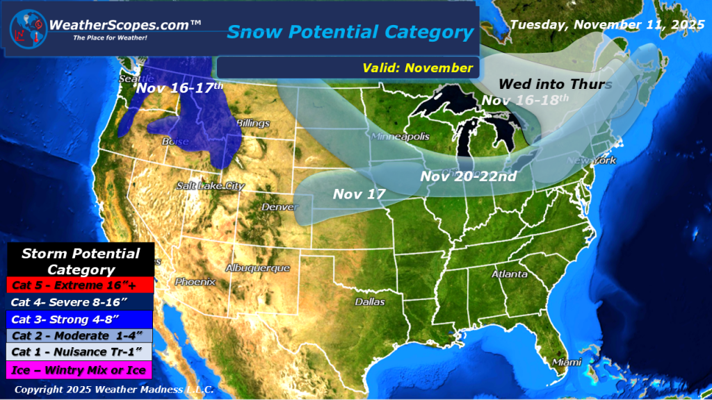 Today as we celebrate all the Veteran’s past and present, more snow and cold will impact the Northeast. Clipper snows will continue in the Northeast with areas along the Great Lakes seeing the heaviest snowfall with 4”+ possible. Most will see a coating to 2”. The rest of the US, especially the West is warm and sunny. The Plains and Midwest will see temps warm up the next few day, feeling like the summer after the cold, windy, snow the past two days. Temperatures will get into the 50’s and 60’s for some areas, holding on to the last few days of warmth before we fully embrace winter.