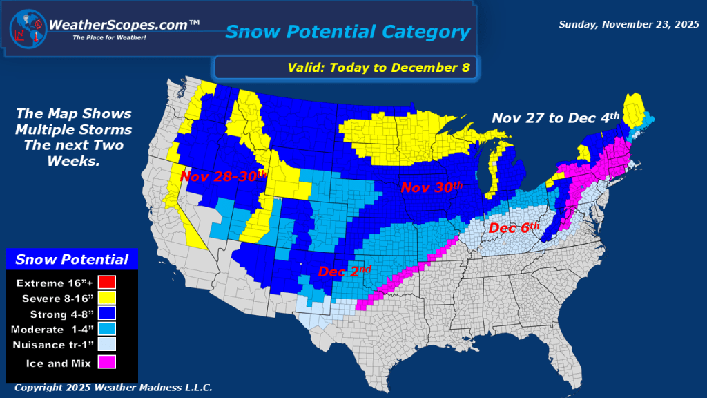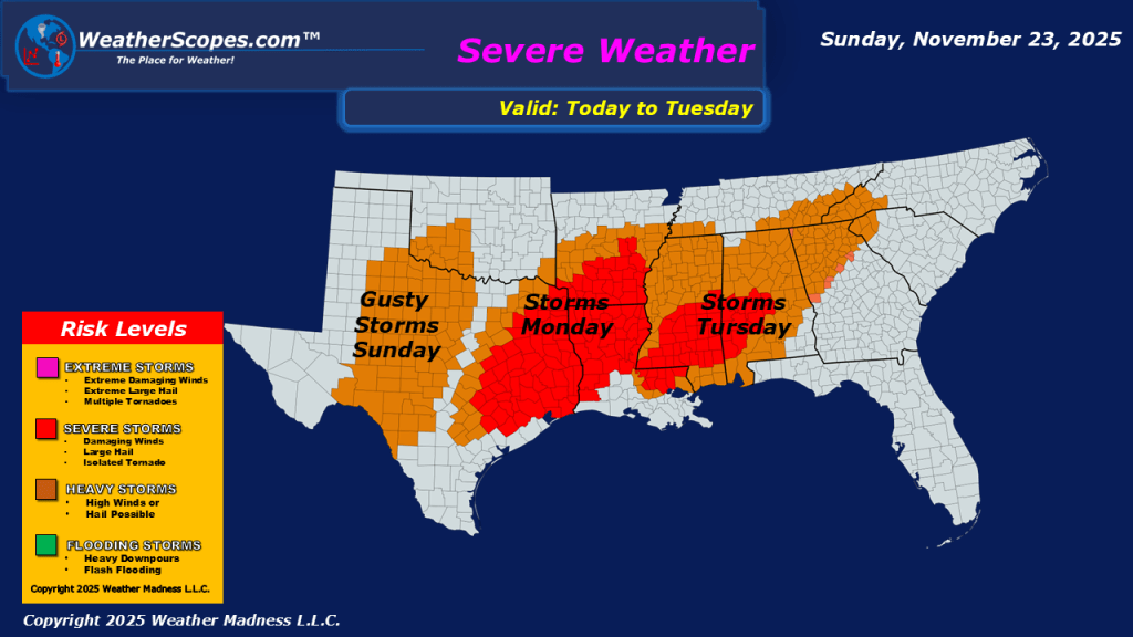 This morning we are seeing some showers and thunderstorms in the Southwest, and some snow showers making their way through parts of the Northeast. Today will also bring some gusty storms to Texas and the Lower Mississippi Valley. With these storms we can expect some gusty conditions and the possibility of these storms becoming severe. Over the next 24-48 hours Texas into the Mississippi Valley and parts of the Southeast could see a chance for some localized flooding. This week we are tracking some snow just in time for Thanksgiving. A few systems look to come through the Plains, Great Lakes, and into the Northeast this week, and will be closely monitoring them as the week continues.