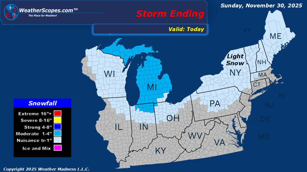 This morning we will see some light snow move through the Upper Great Lakes and into the Northeast today, with accumulations of a coating to 4” on the heavy side. Much of the Northern portion of the US still dealing with cold temps today and for the coming week. We will see some rain showers in the Southeast up into the DC area today. The Rockies look to see several inches of snow today, and the Denver metro area could also see some snow today as well.
