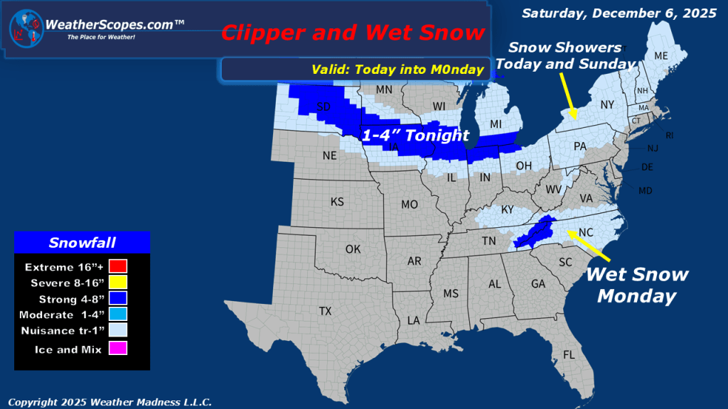 Today’s weather brings a mix of conditions across the country, with showers expected across the Southeast while the Rockies continue to see snow in the higher elevations. This morning through today and into tomorrow, a quick-moving clipper system will sweep through the Plains and into the Great Lakes, and Northeast bringing 1–4 inches of accumulating snow and creating some slippery travel. The interior portions of the Northeast will pick up additional lake-effect snow, with totals ranging from a light coating to around 2 inches. Throughout all of this, cold temperatures will continue to grip the Plains, Midwest, and Northeast, reinforcing the wintry feel across much of the region.