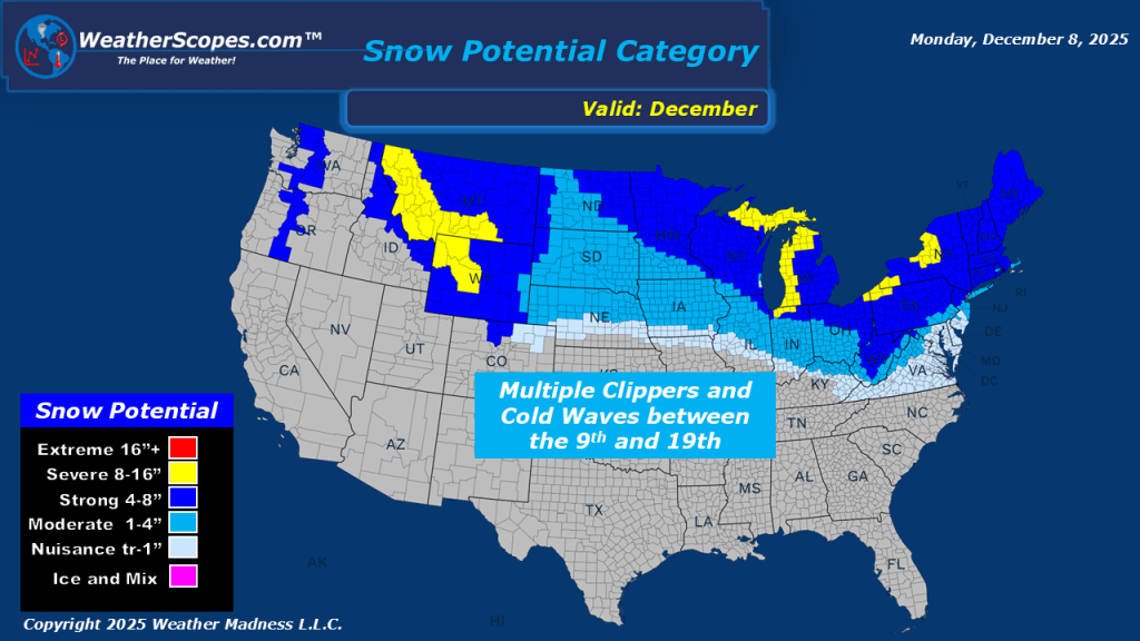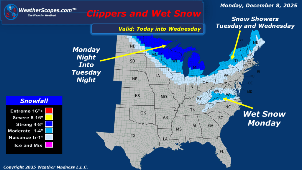 This morning we are already seeing some mixed precipitation across Tennessee, Kentucky, the Virginia’s and into North Carolina. The Virginia’s, Kentucky, and Tennessee look to see some wet accumulating snow 1-4”, while areas along the Virginia/North Carolina border could see some snow and rain. Out in the Pac NW still dealing with some heavy rains today, which could lead to some localized flooding. More snow today in the Northern Rockies. Another clipper comes into the Plain and Upper Great Lakes today and into tomorrow bringing the area a coating to 4-5” in the Northern Great Lakes and UP of Michigan. This week looks to be one clipper after another coming through the Plains, Great Lakes and into the Northeast.