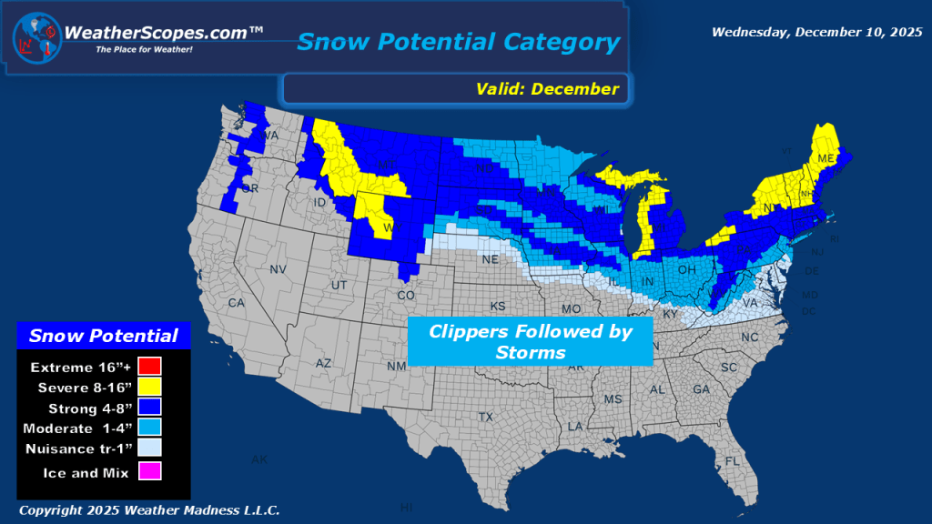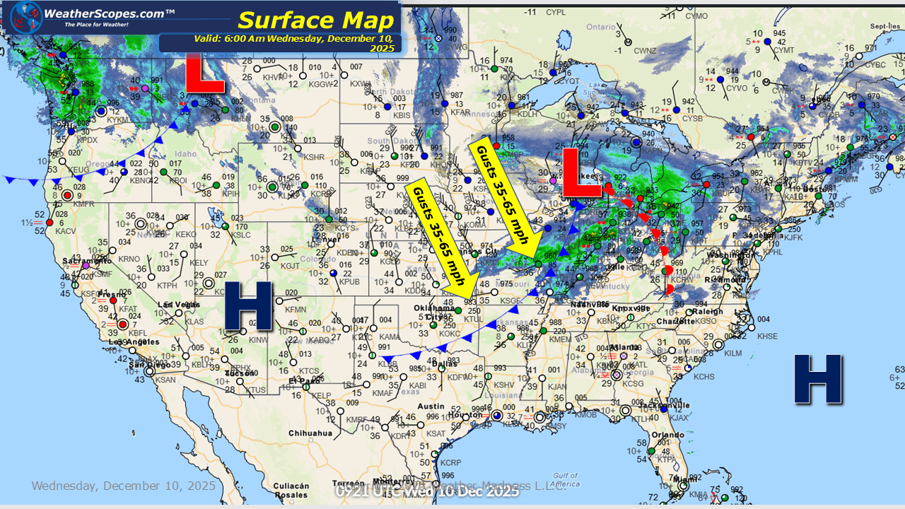 The Pacific Northwest continues to contend with periods of showers and isolated thunderstorms today, maintaining the risk for localized flooding in areas that have already seen several rounds of precipitation. Farther east, it’s another day and another fast-moving clipper sweeping through the Upper Great Lakes and progressing into the Northeast. North of the system, light snow will accompany its passage, while south of the track, pockets of rain are expected across portions of the Midwest and the Ohio Valley. Noticeably gusty conditions today behind the clipper coming through. Some areas could experience wind gusts reaching up to 65 mph.