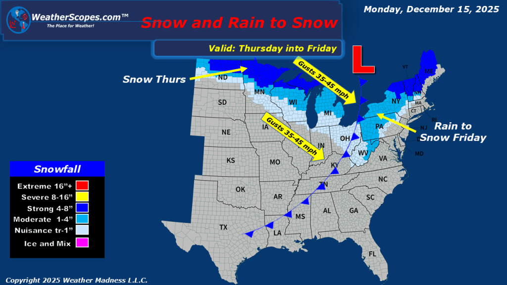 This morning, we are seeing a clipper come through the Upper Great Lakes and will continue into the Northeast today, bringing snow and some lake-effect snows. Accumulations look to be around 1-4”. Areas around Watertown, NY could see accumulations over 4”. Showers and thunderstorms will move through the Pac NW today, creating the potential for some localized flooding. Cold weather still impacting the Northern Plains, Great Lakes, and Northeast today. Over the next 48 hours we could see a reprieve from the cold weather with temps in the 40’s and 50’s, but the cold returning by the end of the week.