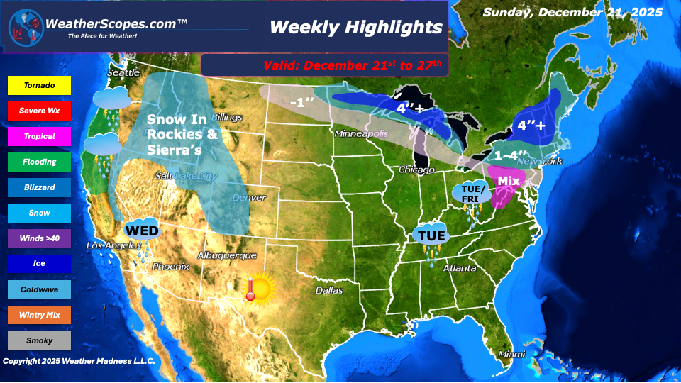 Rainfall will be more common from the Northeast through the Tennessee Valley, with colder air keeping the bulk of the snow farther north. Temperatures will start the week on the colder side across the Plains, Midwest, and Northeast. As the week progresses, a moderating trend is possible, and some areas could experience milder conditions around the holiday, with temperatures reaching into the 40s and 50s. Happy Holidays!