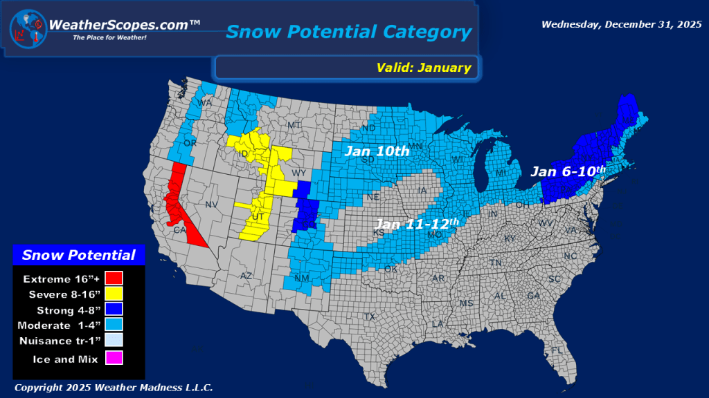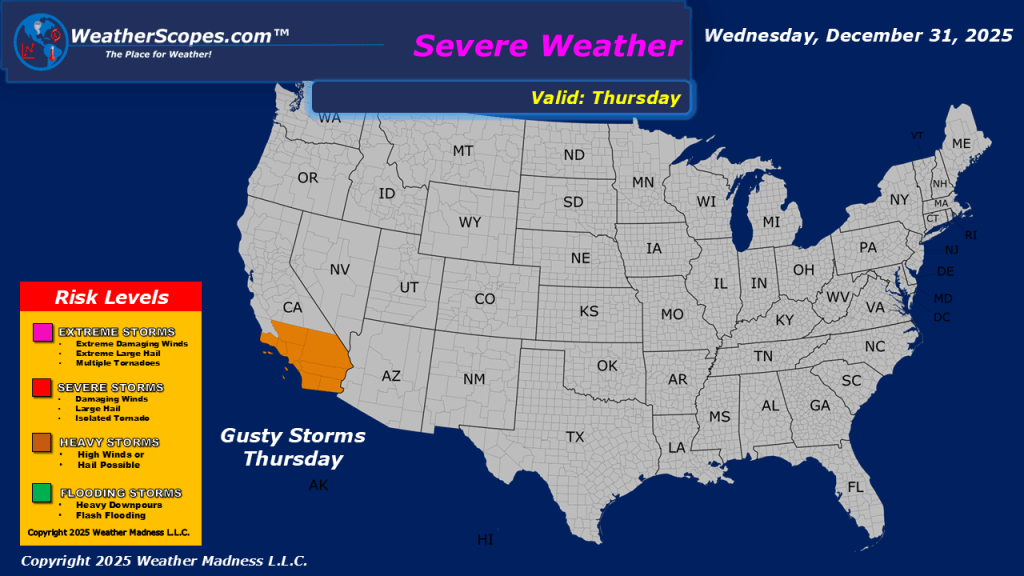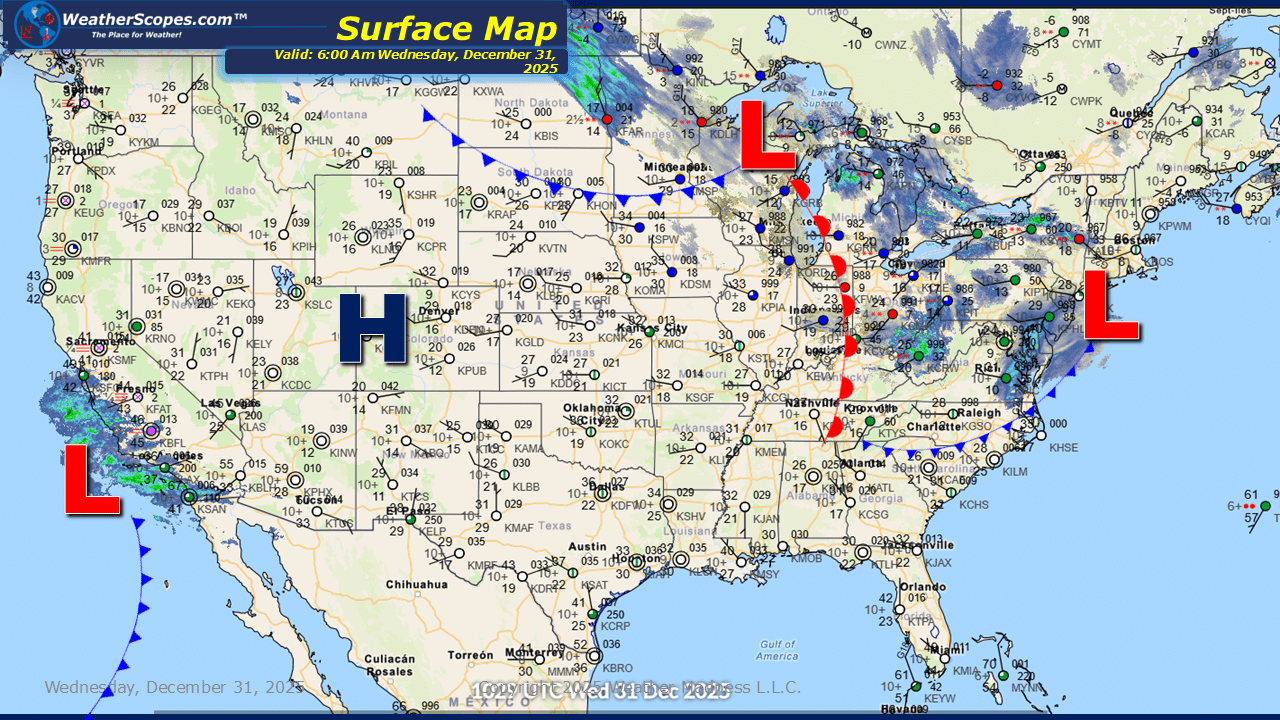 This New Year’s Eve morning, we are still seeing some lake-effect snows in the Northeast, and we will see a clipper come through the Great Lakes and Ohio Valley later today. The clipper looks to bring a coating to 2” of accumulating snow, while the lake-effect snows continue to build up snow totals in the Northeast, and gusty conditions will again make for some blustery conditions. Southern California will see showers and thunderstorms return today. Some of those storms could be severe, and the threat of flooding to the area is another major concern after all the rain the area has seen over the last week.