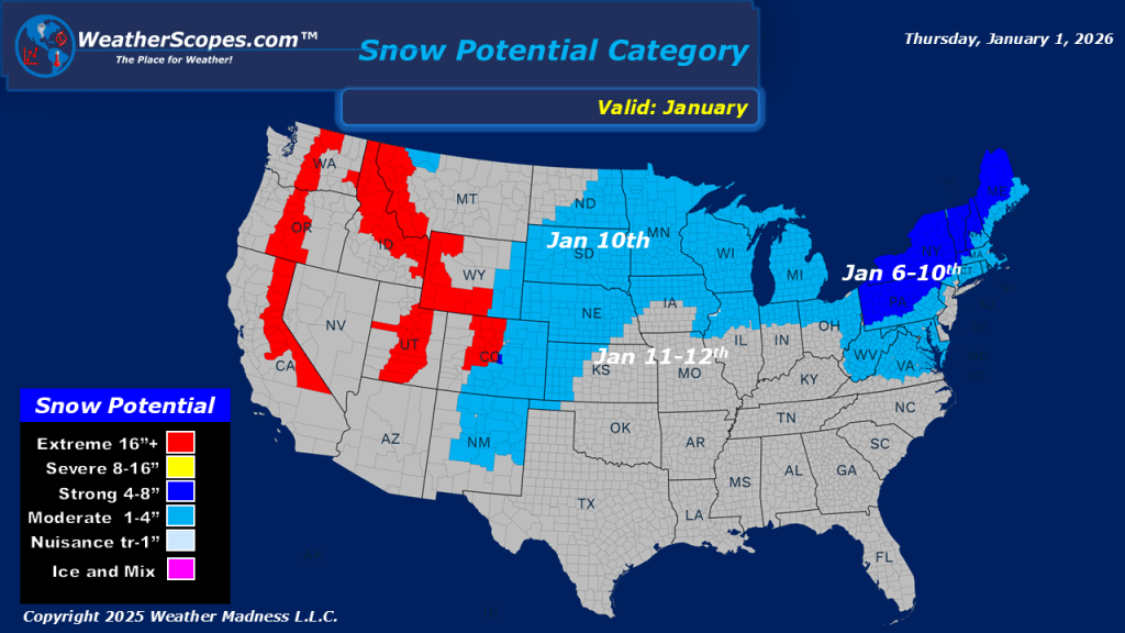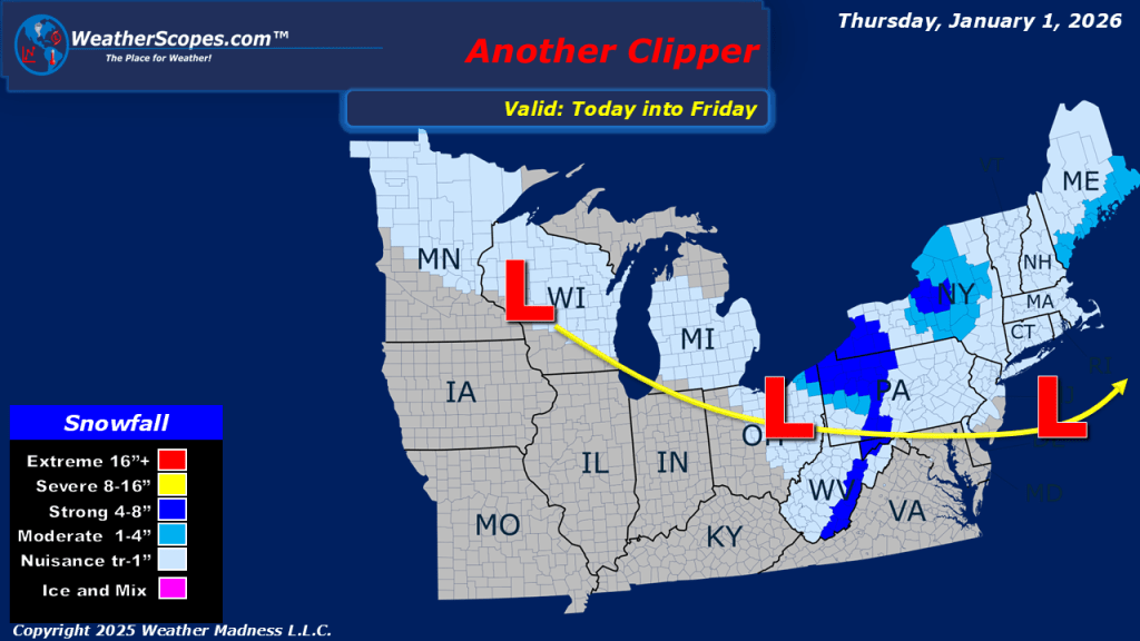Happy New Year! This morning, we are seeing another clipper come through the Great Lakes into the Northeast, bringing a coating to the area and some higher amounts in areas near the Great Lakes. Some lake-effect snows will also linger around today as well, increasing snow amounts. Showers and thunderstorms continue to impact Southern California and increase the risk of the ongoing flooding issue, and some of those storms could be gusty at times. Showers will also impact the Pacific NW today as well. The Rockies and Sierra’s will see some snow today in the higher elevations. The cold still impacting the Northern Plains through the Great Lakes and into the Northeast, as temperatures are in the single digits in certain areas of the Plains.