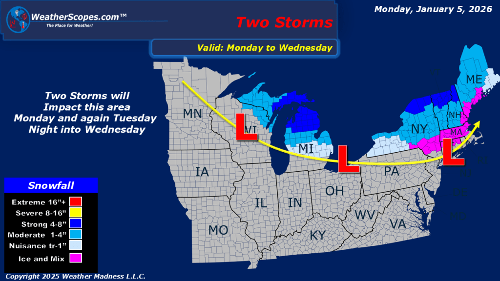 This morning, we are seeing out first clipper of the week come through the Upper Great Lakes into Canada and portions of the Northeast. Accumulations look to be around 1-4”. Snow in the higher elevations of The Rockies and Sierra’s today. Milder weather out in the middle part of the US today. 30’s and 40’s today throughout the area, with some colder air still in the Northern Plains and Great Lakes. Warmer temps the further south you go. These milder temps will last a few days and then the cold comes right back, so enjoy it while it lasts. Showers in California yet again today, increasing the potential for some localized flooding.