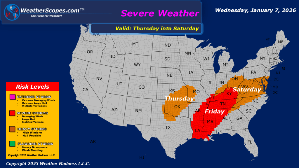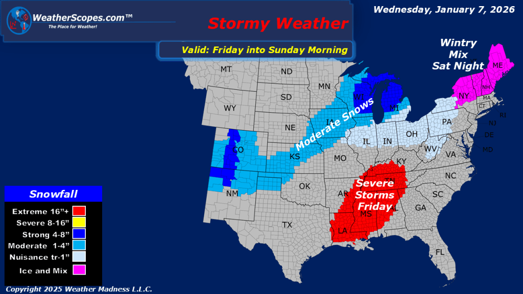 This morning, we are seeing some mixed precipitation in the Northeast with rain/snow and freezing rain. Snow today out west in The Rockies. Some showers in the Southwest today. Mild temperatures continue for much of the Central US today, which has been nice to be above freezing. Looking ahead some stormy weather over the next few days for the Central US into the Eastern part of the US. Behind the stormy weather we will also see some snow come out of Denver into the Plains, and Great Lakes come Friday and Saturday. Areas of the Mississippi and Tennessee Valleys could see a chance for some localized flooding on Friday.
