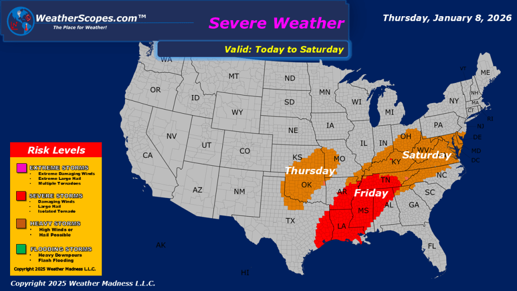 This morning, we are already seeing showers and thunderstorms move across the Plains into Oklahoma and Texas. This system will move through the Midwest and Great Lakes throughout the day. Some severe weather is possible with this system as gusty storms and heavy downpours could become an issue. A tornado can’t be ruled out with this system across parts of eastern Oklahoma, but Friday looks to be a day we could see a few tornadoes. On the back end of this system parts of Nebraska, Iowa, Minnesota, Wisconsin and the UP of Michigan will see snow. Accumulations look to be on the low end with a coating to 2”, with areas in Central Wisconsin around the Wausau area seeing the most with 3-5”. More showers and thunderstorms out in the Four Corners states, and snow in the higher elevations of The Rockies. The next few days look to be pretty active with more storms in the south and cold weather returning to the Great Lakes, Midwest, and Northeast.