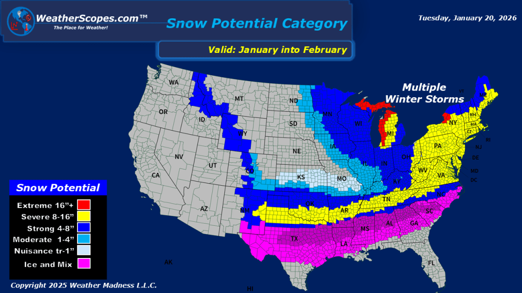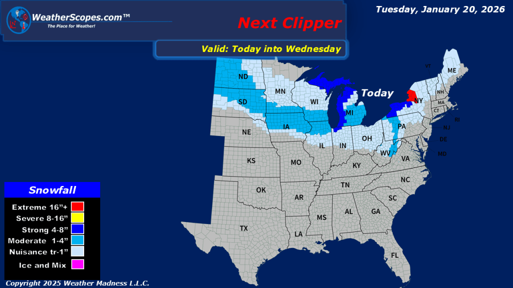 This morning, we are seeing some lake-effect snows in the Great Lakes and Northeast. Another clipper will come through the Northern Plains into the Great Lakes later today and into tomorrow. Accumulations look to be around a coating to 4”. The UP and Western Michigan will see heavier accumulations, as well as the Buffalo and Watertown NY area. The cold still impacting much of the eastern portion of the US with single digit temperatures in a lot of area this morning, and some below zero temperatures in the Upper Great Lakes. Looking ahead there is potential for the south to see a mixed precipitation storm come through this weekend bringing ice and dangerous conditions to the area.