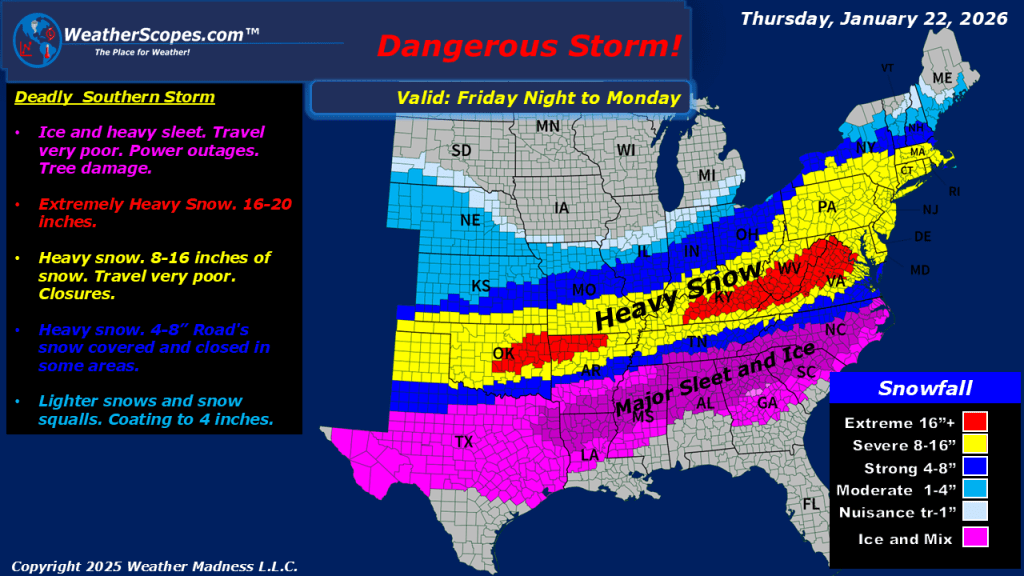This morning, we are seeing some lake-effect snows in the Great Lakes and into the Northeast. Accumulations look to be around 1-4” with areas closer to the Great Lakes potentially seeing 4”+. We have some rain showers out across the Southeast. The story over the next few days will be the extreme cold and snow/ice event that will impact the southern portions of the US. Cold, cold weather will come into the Northern Plains into the Great Lakes and Northeast tomorrow. High temps will be in the single digits, and some areas will see highs below zero. Wind chills will also be well below zero creating for a blustery day. The southern storm looks to bring some heavy snow and ice to the area, creating some dangerous weather. Not only will driving be dangerous most areas will experience power outages from all the ice. It will be an interesting next few days for areas impacted by this storm.