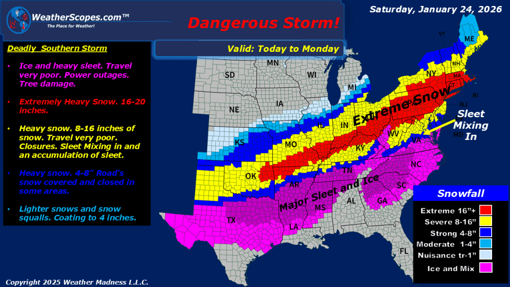 This morning, we are seeing Winter Storm Fern start to impact the south. Rain, Freezing rain, sleet, and snow are all in play today and into tomorrow, from Texas to Maine. Snow and ice accumulations will create hazardous driving conditions as well as power outages. The heaviest snow will be across Eastern Oklahoma into the Mississippi Tennessee and Ohio Valleys. Those areas could see over 16” of snow. We are still seeing some very cold temperatures in the Plains, Great Lakes, and Northeast. Temps are still below freezing this morning for much of the Plains and Great Lakes. Single digits in the Northeast as well this morning, creating some blustery conditions. We will have to watch and see how Fern plays out and just how much snow and ice areas will see.