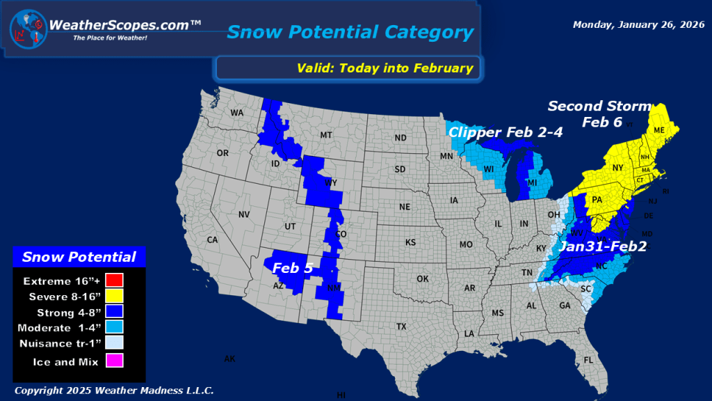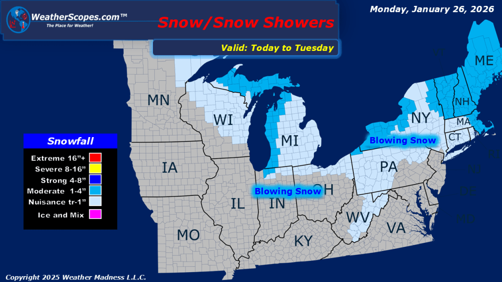 This morning, we are seeing what’s left of Winter Storm Fern exiting the Northeast still producing some snow in upstate New York to Maine. A cold start to the work week for areas in the Plains, and Great Lakes with temperatures this morning in the single digits and in areas well below zero. The cold has stretched into the south as well this morning and will stay for the eastern portion of the US this week. Some showers exciting the Carolinas this morning. Today we will see some lake-effect snow in the Great Lakes and into the Northeast. Gusty conditions throughout the day will create some blowing snow in the Great Lakes and Northeast. Accumulations look to be a coating to 4”, with the higher totals closer to the Great Lakes. Looking ahead still watching for our next snowstorm this weekend that looks to impact the Mid-Atlantic states into the Northeast.