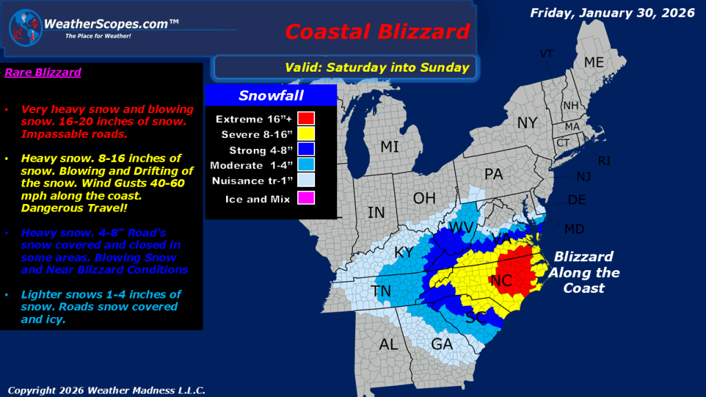 This morning, light snow is occurring across the Plains, with accumulations ranging from a light coating up to 1 inch. Lake-effect snow will once again impact the Great Lakes region today, with the heaviest accumulations expected in the Upper Peninsula of Michigan, the Buffalo area, and southeastern Wisconsin into the Chicago metro area. Most locations in these regions can expect snowfall totals of 1 to 4 inches. Cold air continues to affect the Plains, Great Lakes, and Northeast, with temperatures in the single digits and some areas experiencing well below zero readings. The Tennessee Valley may see light snow showers later today. A significant winter storm is expected to bring blizzard conditions to the Carolinas and Virginia tomorrow. Some areas could receive over a foot of snow, and strong, gusty winds will make travel extremely dangerous. Areas farther north and west will see lighter snowfall amounts. Areas farther south, including the Atlanta metro area, could also see a light coating of snow. As the storm moves eastward, parts of Cape Cod could see snow as the system exits into the Atlantic.