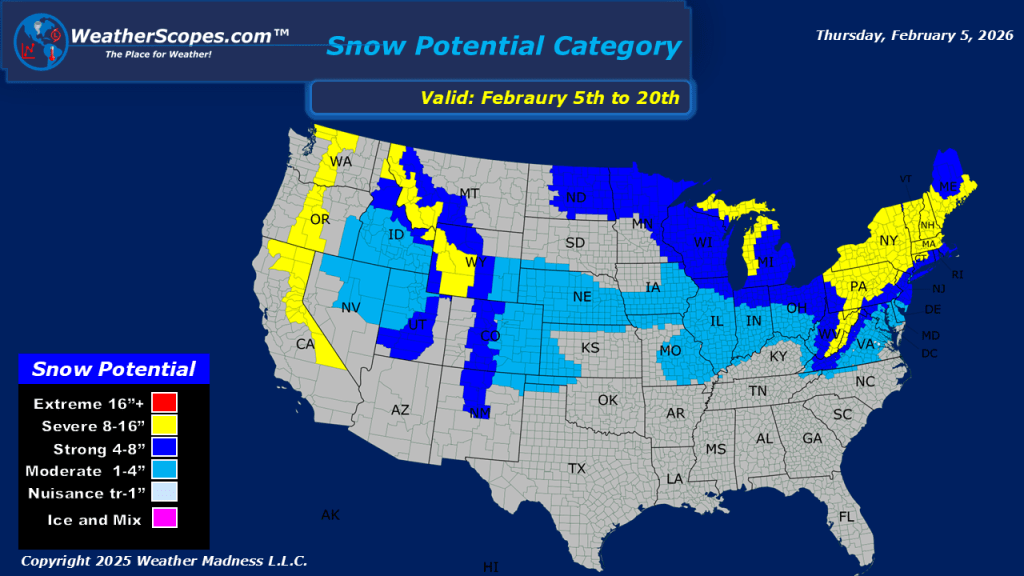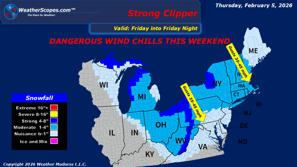 This morning, we are seeing our next clipper come through the Great Lakes. Accumulations look to be light with a coating to the area. Later tonight and into tomorrow another clipper will come through the Great Lakes, the Northeast and into parts of the Mid-Atlantic States. Accumulations tomorrow look to be a coating to 4”, with some areas in along the Lakes and into the Appalachians seeing over 4”. Still watching some dangerous cold and wind chills, that will come into the Northeast this weekend.