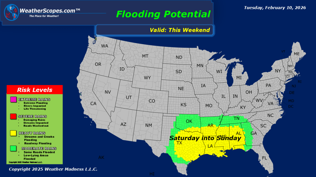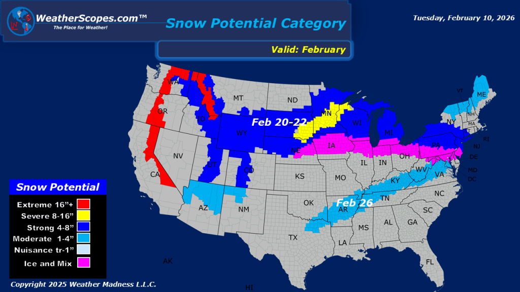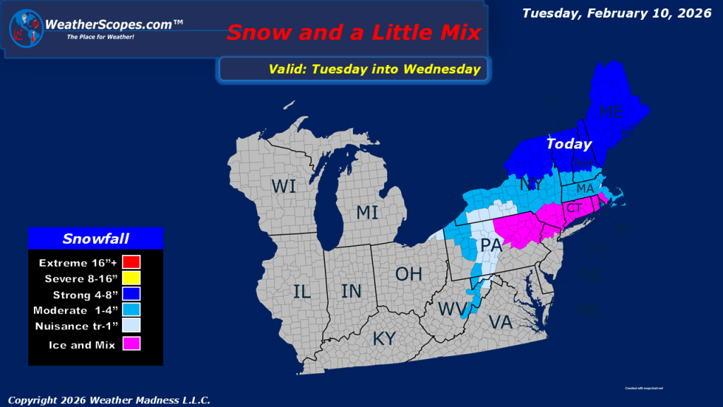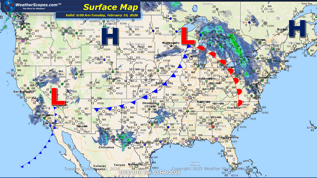 This morning, we are seeing a clipper come through bringing snow to upstate NY, through Vermont, New Hampshire and into Maine. Another clipper will come through the area again on Wednesday. Total accumulations look to be over 4” for the area. While areas to the south will see 1-4” from these clippers over the next day. Portions of Pennsylvania into NJ and CT, could see some mixed precipitation from this system later tonight and into tomorrow morning. Showers out across Texas today that will move into the Mississippi and Tennessee Valleys later today. More showers will develop across California later today, which will produce some snow in the Sierras.