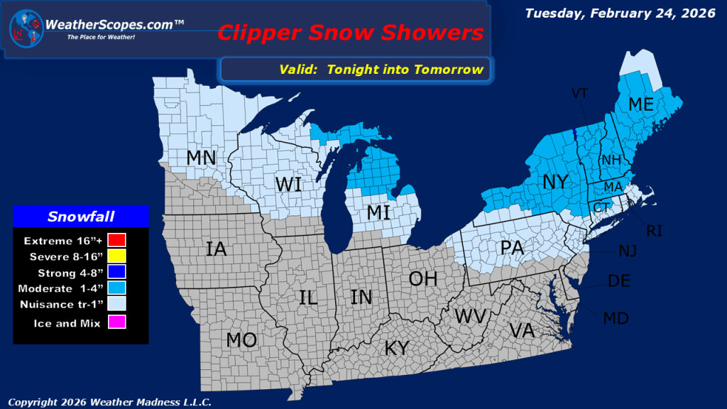 This morning, we are seeing some rain continue to impact the Pacific Northwest and into Northern California, where the area could see some localized flooding from the rain that has fallen over the last few days. Saturated ground conditions combined with additional precipitation may lead to ponding on roadways, rises on small streams, and minor flooding in low-lying or poor drainage areas. Farther inland, winter weather remains active across parts of the northern tier. We are seeing snow across the Upper Great Lakes moving to the east, and it will impact the Northeast tonight and into tomorrow. Accumulations look to be light, with a coating to four inches in most areas. While totals are not expected to be significant, even light snowfall can create slick travel conditions, particularly during the overnight and early morning hours. In the Northern Rockies, snow is also expected today as another disturbance moves through the region. Mountain passes could see accumulating snowfall, leading to winter driving conditions at higher elevations. Communities across Idaho, western Montana, and northwestern Wyoming may experience periodic bursts of snow, with locally higher totals in favored upslope areas. Cold air continues to hamper the eastern part of the United States. Below-average temperatures persist from the Plains through the Midwest and into the Mid-Atlantic.