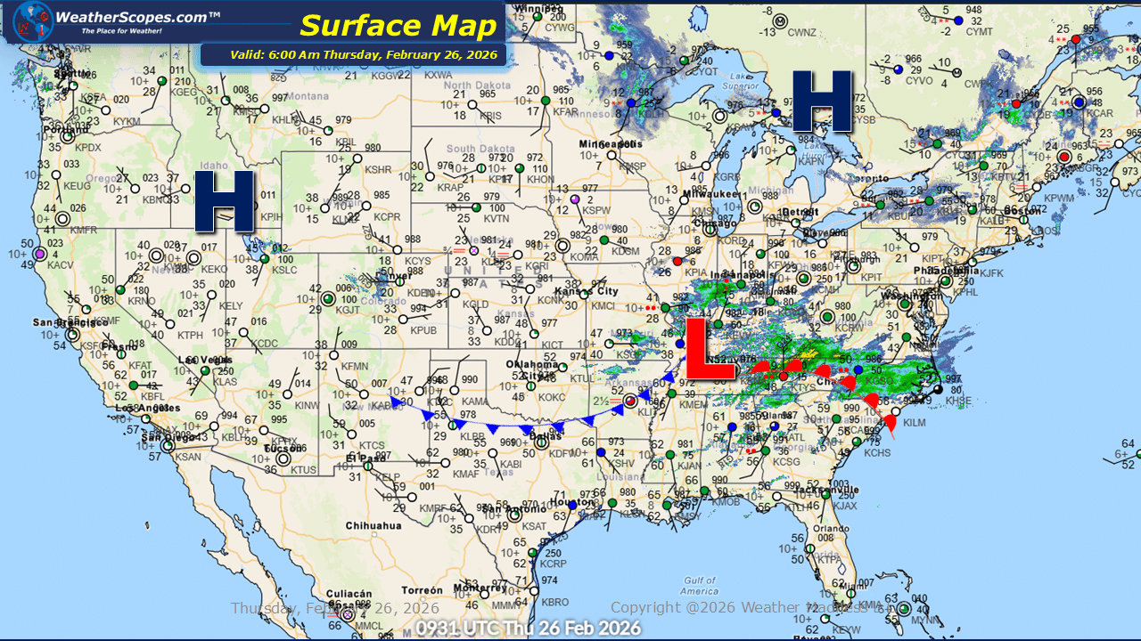 This morning, we are seeing some showers come through the Southeast into the Mid-Atlantic states. Just to the north in the Ohio Valley there is some light snow falling. Accumulations will be light with a coating at most, primarily on grassy and elevated surfaces. Additional light snow is moving through the Upper Great Lakes, where accumulations will range from a coating to 2 inches. While snowfall totals remain modest, motorists should remain mindful of locally slick conditions, particularly during the morning and evening hours. Out West, the primary concern continues to be wind. Gusty conditions persist, with gusts reaching into the 40 to 50 mph range in some areas. These winds may lead to difficult travel for high-profile vehicles and could contribute to isolated power disruptions. Cold air remains firmly in place from the Plains through the Midwest and into the Northeast. A slight warm-up comes today and tomorrow in these regions, with temperatures climbing into the 40s and 50s. However, this moderation will be short-lived, as colder air is expected to return heading into the weekend.