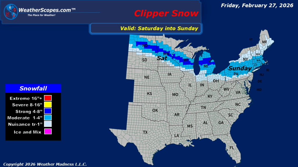This morning, we are seeing some rain showers come through the Carolinas and stretching back along the Gulf Coast. A notable warm-up is underway. Some milder weather is settling in today across much of the Plains into the Midwest and Northeast. Portions of the Plains will see temperatures climb into the 70s, an impressive mark for late February. While it will not be quite as warm the farther north and east you go, much of the Midwest and Northeast will still enjoy readings that are well above seasonal averages. This brief blast of mild air, however, will be short-lived. The warmer pattern is expected to last roughly 24 hours before colder air begins to push back in. By the weekend, winter will reassert itself across the Northern Plains and the Great Lakes, where colder temperatures and accumulating snow are likely to return. Conditions remain relatively quiet across the country today, with no major storm systems causing widespread disruption. Looking ahead to the weekend, attention turns to a clipper system expected to move through the Upper Great Lakes and into the Northeast on Saturday into Sunday.