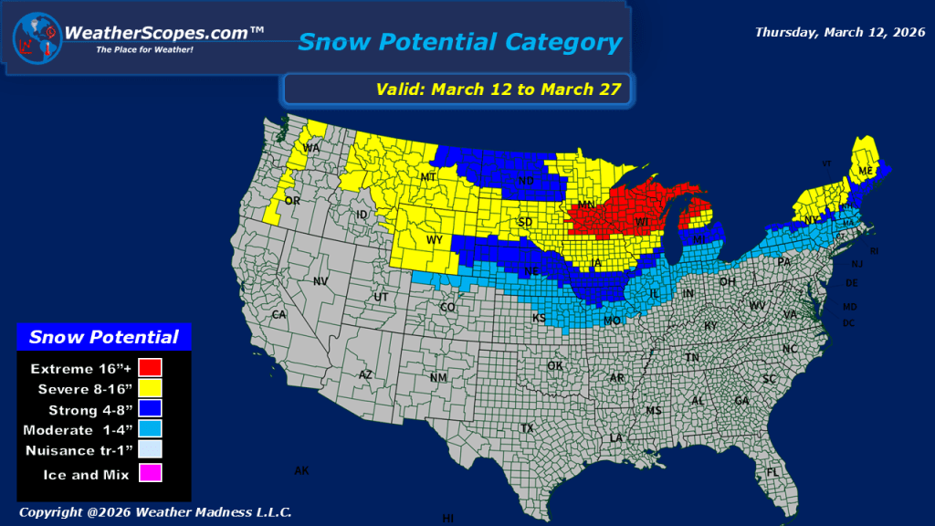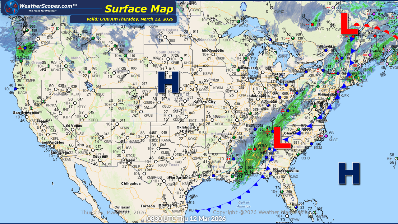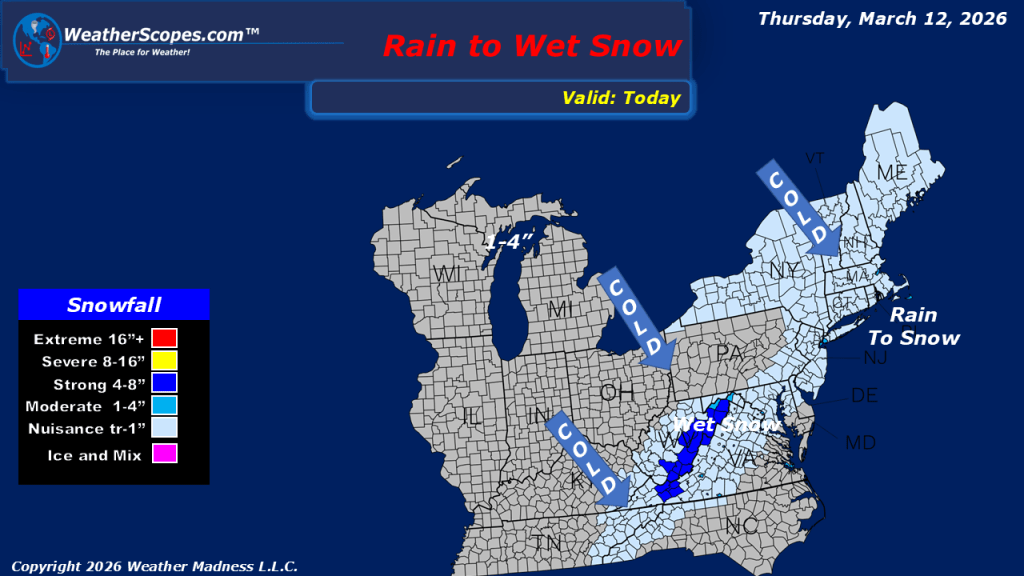 This morning, we are seeing showers and thunderstorms out ahead of a cold front moving through the New England area, stretching south along the Mid-Atlantic states and all the way through the Southeast. As this system continues to push eastward and move out into the Atlantic, colder air wrapping in on the back side will allow precipitation to transition to snow in some areas. Parts of the Northeast through the Virginias and portions of the Mid-Atlantic states could see a coating to as much as 2 inches of snow, particularly along the higher elevations of the Appalachians. While snowfall totals will remain light overall, the changeover from rain to snow may lead to slick spots in elevated terrain. Farther west, snow is already developing this morning across portions of the Northern Plains. This system is expected to track eastward into the Upper Great Lakes later tonight and into tomorrow. Most areas will see accumulations of 1 to 4 inches, with locations closer to the Canadian border potentially receiving more than 4 inches. Across the western United States, unsettled weather continues as well. Additional showers and snow are expected in the higher elevations of the Northern Rockies and across parts of the Pacific Northwest, where cooler and active conditions persist. Colder weather is returning to the eastern part of the country after several days of very mild and pleasant temperatures. As the cold front moves through, gusty conditions will also develop across the Northern Plains, where wind gusts between 50 and 60 mph + will be possible, creating potentially hazardous travel conditions in open areas.