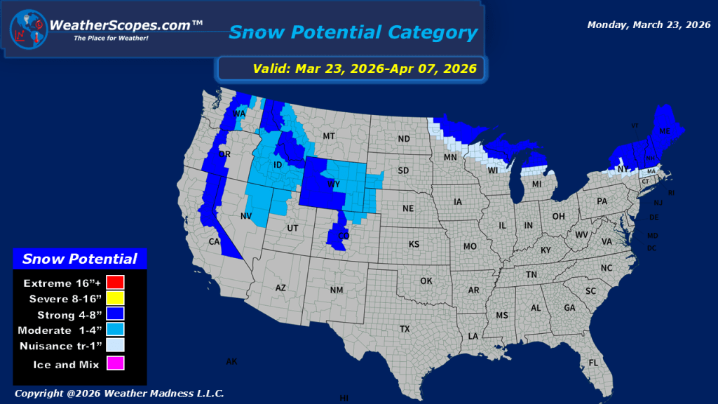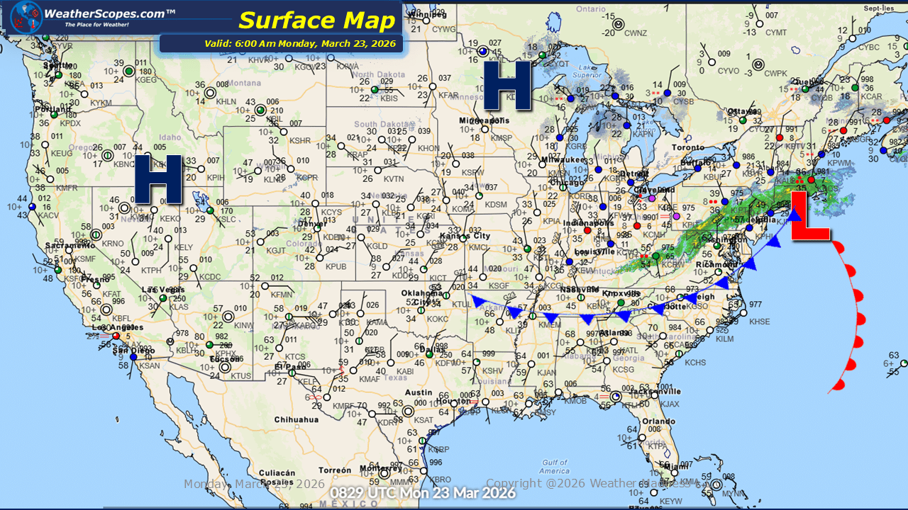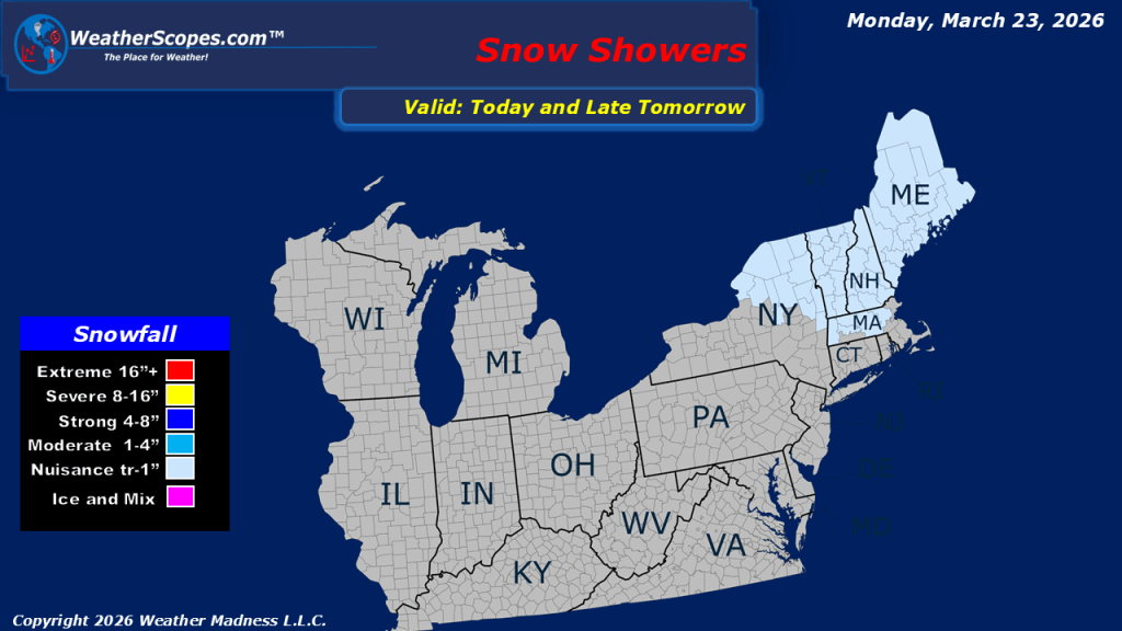 This morning, showers are exiting the Northeast following a round of storms that produced 95 reports of hail and damaging winds across the region. On the back side of this system, parts of New England, especially northward into Maine, may see some light snow, with accumulations generally limited to a coating at most. Farther south, along the Carolina coast, additional showers and thunderstorms could develop later today. Meanwhile, colder air is settling into the Northern Plains, extending through the Great Lakes and into the Northeast. Looking ahead, a clipper will move into the Upper Great Lakes late tonight into tomorrow, bringing light snowfall to the UP of Michigan, where a coating to around one inch is expected.