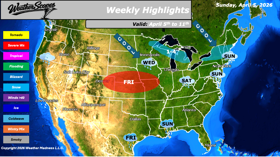 This week’s weather pattern across the United States will feature a mix of active conditions, temperature swings, and regionally varied impacts as spring continues to evolve. Easter Sunday begins on a wet note for much of the eastern half of the country. From Maine down along the coast and into the Gulf states, widespread showers are expected, with thunderstorms more likely across the southern tier. This unsettled start to the day may impact outdoor plans, particularly across the Southeast where rainfall could be heavier at times. As the week progresses, a shift toward cooler conditions will take hold across the Northern Plains, Great Lakes, and portions of the Northeast. These areas will experience below-average temperatures overall, though brief periods of milder weather are expected to break through at times. Looking ahead to next weekend, a more noticeable warming trend is anticipated across the eastern United States, offering a more seasonable feel.