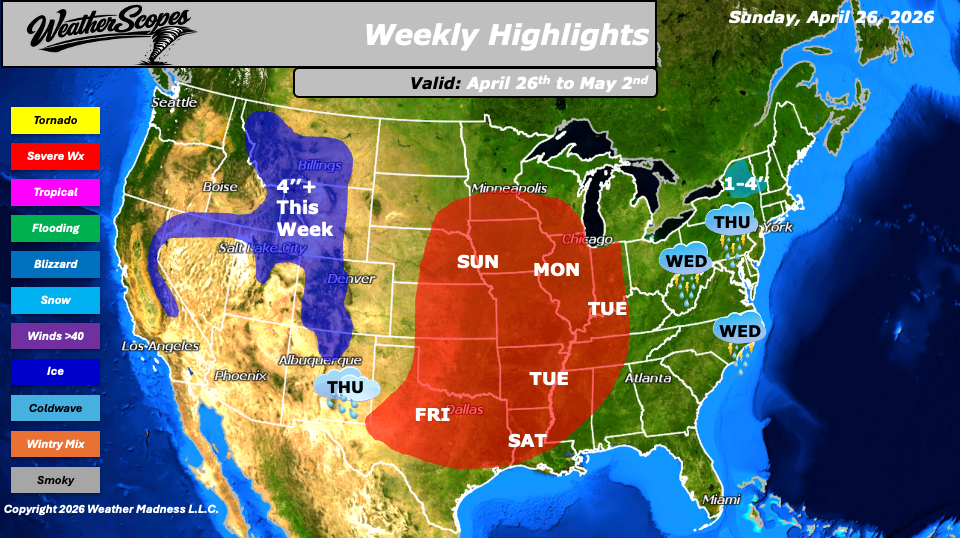 This week’s weather will focus a dynamic system that will drive conditions beginning Sunday, when severe weather is expected to develop across the Plains. This threat will shift into the Midwest on Monday, where all hazards will be in play, including a heightened risk for tornadoes. By Tuesday, the focus for strong to severe storms transitions into the Ohio and Mississippi Valley, maintaining a broad corridor of unsettled and potentially dangerous conditions.