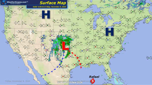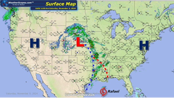 Some storms over the Plains today making their way into the Midwest. Some heavy rain in the Louisiana area today. Hurricane Rafael has been downgraded to a Tropical Storm still just hanging out in the Gulf.